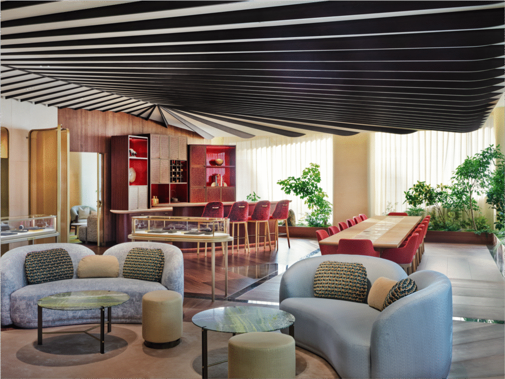 Au-delà des bijoux, la boutique propose des espaces de détente et d’hospitalité, comprenant un salon aux motifs de paon et un jardin intérieur, renforçant l’expérience immersive et invitant les visiteurs à s’attarder.