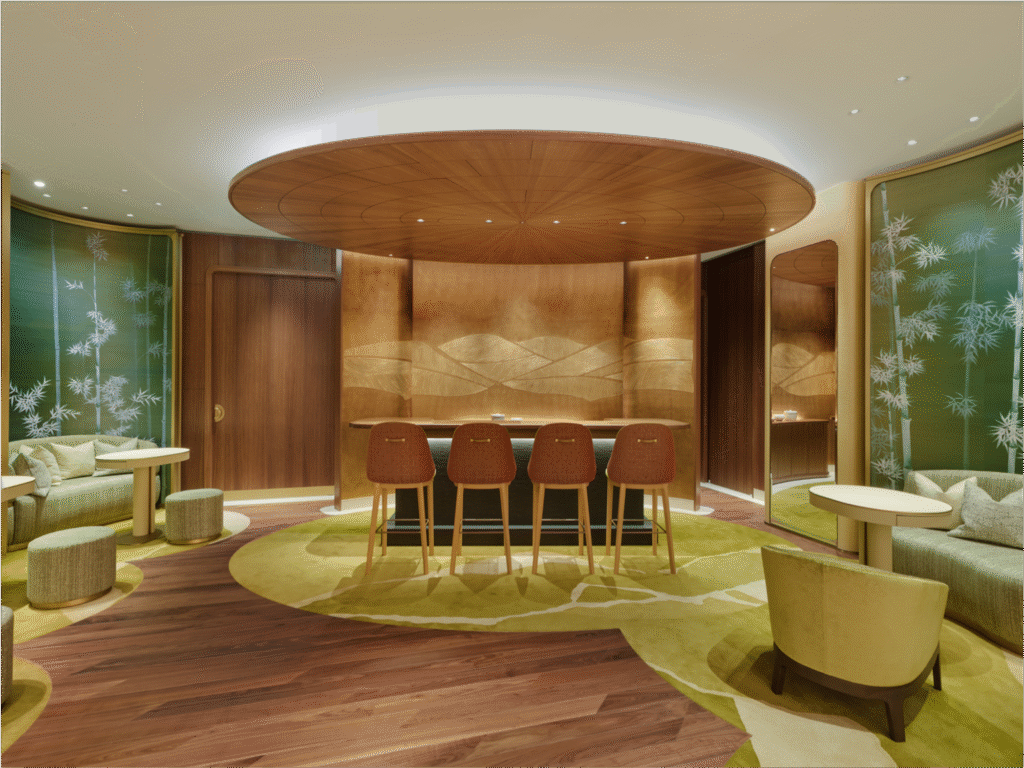 Le sol présente un motif versaillais, les plafonds s’inspirent des pliages de l’origami, et un escalier sculptural s’élance aux côtés d’un bar en forme de pétale d’orchidée, créant un parcours fluide et poétique à travers les différents espaces.